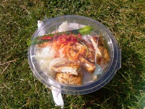 I just wanted to give a bit of a shout-out to a splendid new Vietnamese cafe called Caphe House that has recently opened up on Bermondsey Street, tucked a stone’s throw away from London Bridge station. It’s a small, neat place with modern art pictures on the wall that for some reason makes you feel healthier and virtuous the minute you walk in – must be the wonderful smells emanating from the counter. They offer the perfect alternative to the usual boring British office lunch – if you’re tired of soggy sandwiches, you can instead pick yourself up a zingy noodle salad with roasted meats, prawns or tofu, fresh summer rolls and banh mi (Vietnamese-style pate baguettes sandwiches stuffed with herbs and crudites). Everything is seasoned with wonderful chilli sauce and fish sauce marinades, dotted with fresh coriander and mint and packed with crunchy fresh strips of vegetables. My lunch pictured above was perfect for a sweltering day: fresh rice noodles dressed with fish sauce, lime juice and fiery chilli sauce, topped with lemongrass-infused crispy tofu and packed out with crunchy strips of pepper, cucumber and carrot.