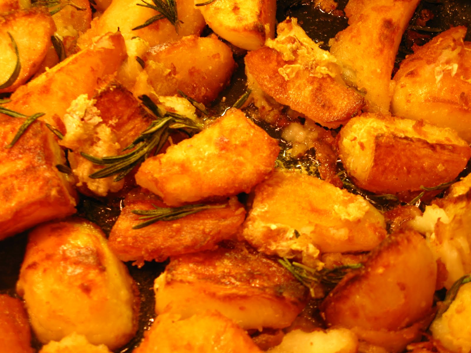 Roast potatoes cooked in goose fat, rosemary and garlic: