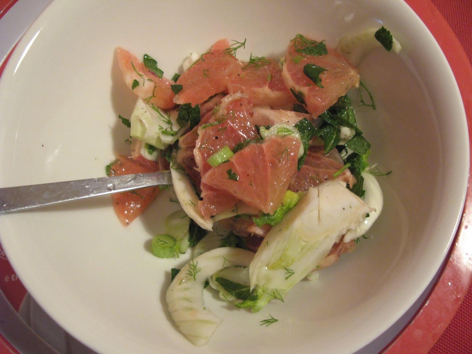 I’m currently whipping through the sublime second series of Mad Men on DVD. I love everything about it, and the attention to 1950s and 1960s detail is lush. But the food you see the characters eating definitely makes me feel grateful to be living in the Teenies (is that what we’re meant to be calling the successor to the Noughties?) Anyway, the sight of Don and Betty tucking into yet another family dinner of creamed corn, devilled lamb chops and tinned marrowfat peas is enough to send me running to the fridge for fresh, crisp zingy ingredients. Which is exactly how this salad came about, somewhere during episodes 8 and 9: it’s tangy, aromatic and full of vitamins, and really easy to make. Just what the January body needs, huh?