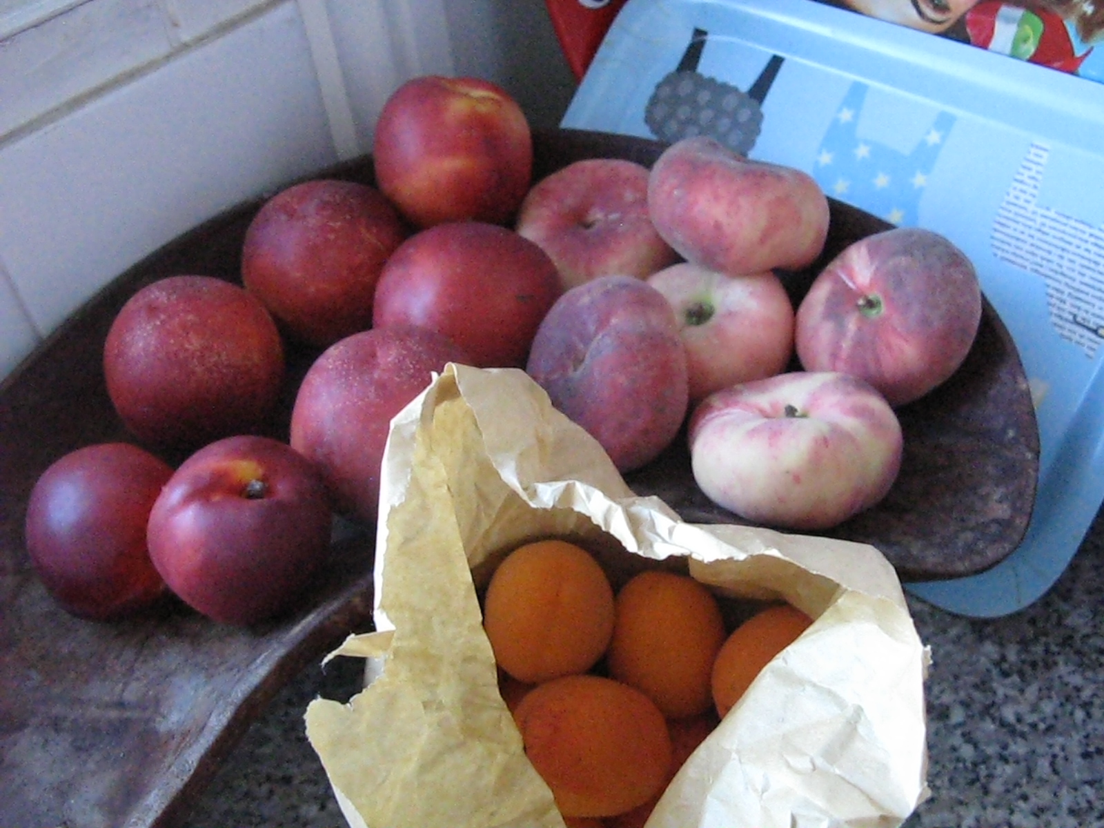Yellow nectarines and flat white peaches (note the smaller, more insipid nectarines on the far left that come from Sainsbury’s), and apricots in the paper bag: