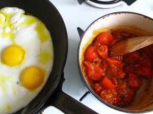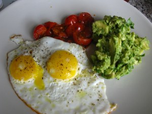 Mexican breakfast – fried eggs, tomatoes with chipotle and guacamole: