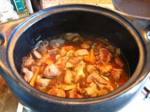 Add all the rest of the ingredients to the pork, add the caramel, put the pot lid on and simmer slowly on your stove top on the lowest possible heat for a minimum of two hours – any less and the meat will be tough.