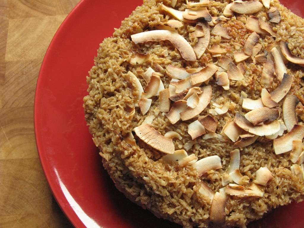 Remove the cake from the oven, then turn the heat up to 220C. Take the coconut mixture and spread it on top of the cake, sprinkle with coconut strips if you’re using them, then return it to the oven and bake for a further 5 – 10 minutes until the topping is a deep toasted golden colour. Take the cake out of the oven and let it cool, before carefully turning out onto a plate.