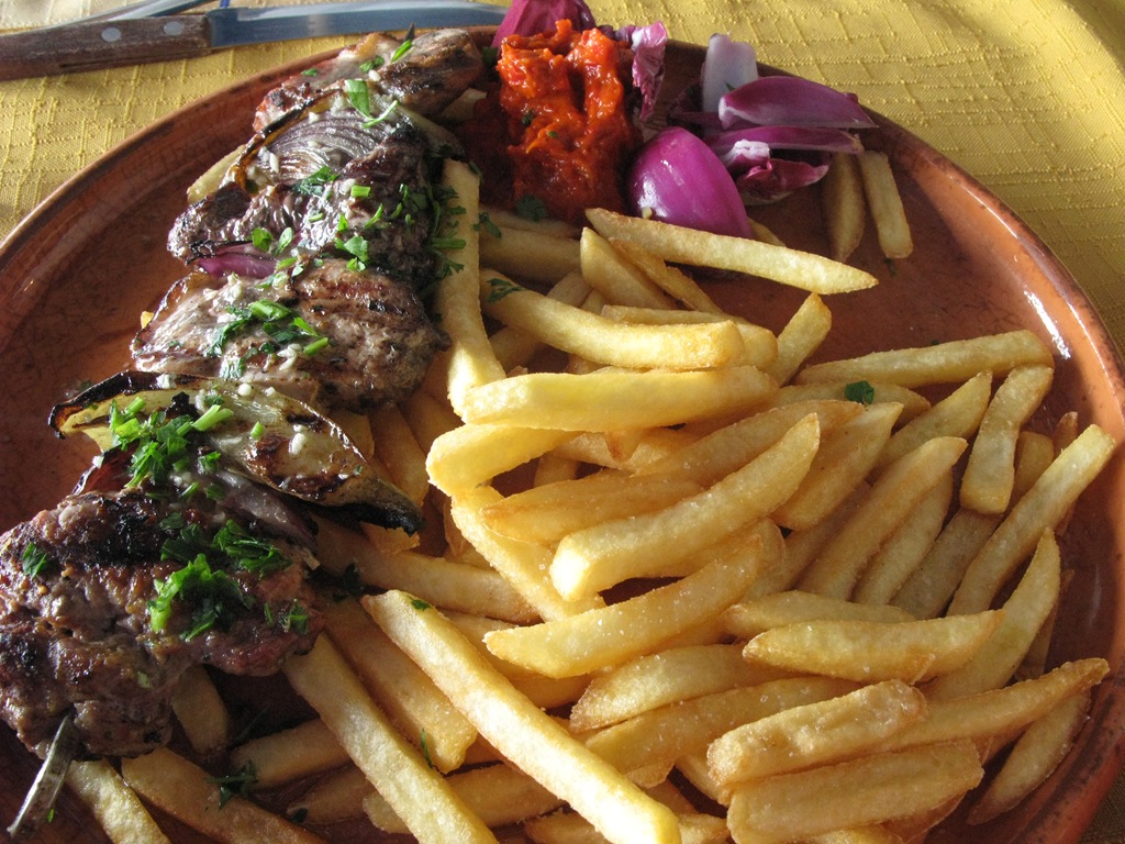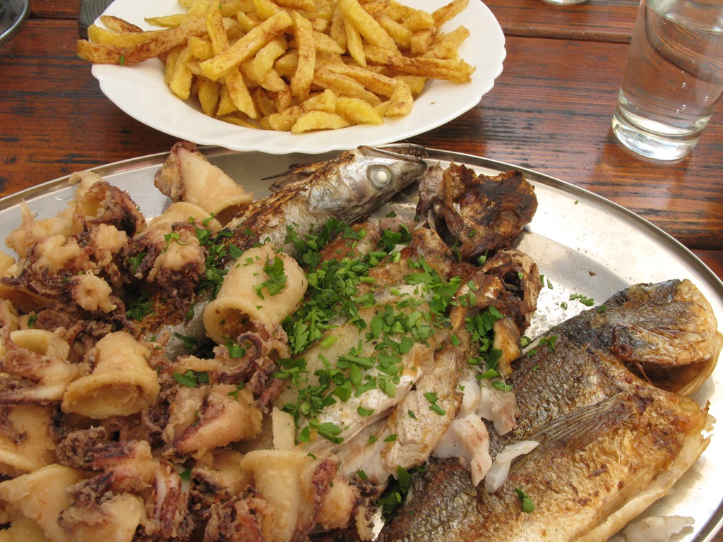 Dishes are big, simple and perfectly ok. Grilled meat, potatoes and fried fish. Not a lemon wedge in sight, sadly: