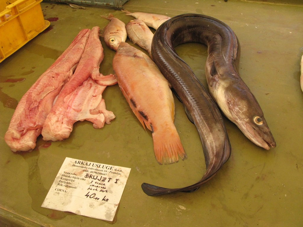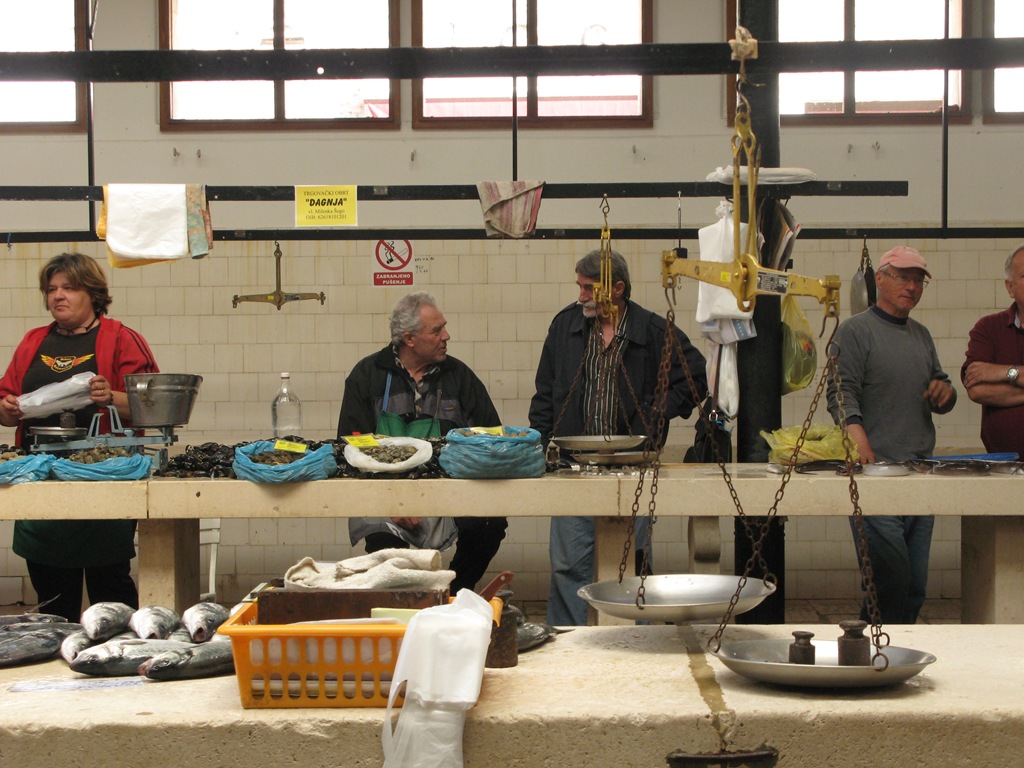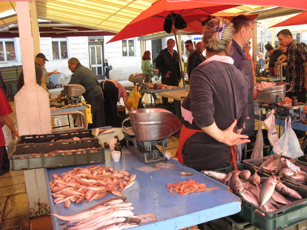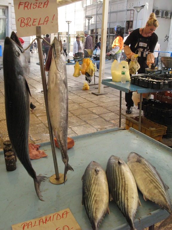 Split’s fish market is where exhausted, yawning fishermen sell their morning’s catch, tucked away in the gothic maze of the old town streets. You wander down narrow alleyways following your nose, then arrive at an ancient stone building that houses stalls of fish so fresh that you can still see some of it moving (gasping) on the tables! We bought fresh langoustines, skipjack tuna and a great big jar of salted anchovies.