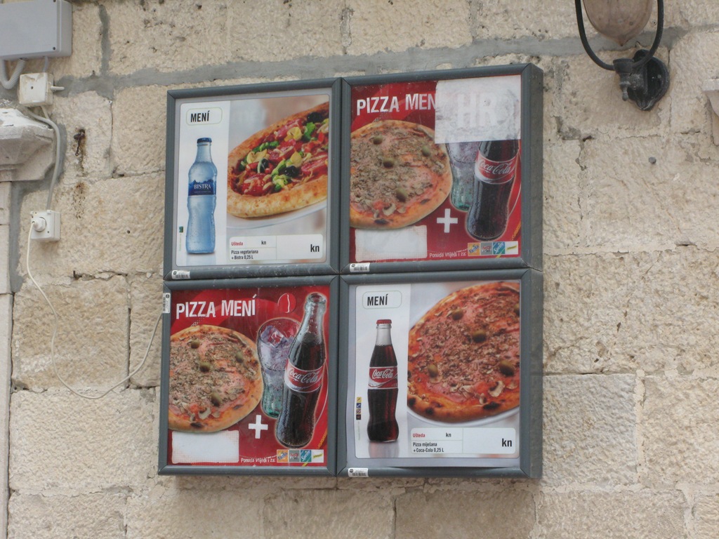 In this part of the country, Croatian cuisine runs along the lines of grilled meat and fish, potatoes and rice, boiled veg and very sturdy pizzas. You can also get pasta and risotto too, great big salty, starchy portions. Not bad, but nothing that memorable. Menus are identical in every single restaurant. That’s completely fine – you can get around the monotony by staying in self catering accommodation, which we did. Our first meal, foraged by my husband very late one Saturday night, was a bag of the favourite national snack, fried dough, bought from a very grumpy lady in a kiosk. (A similar dough kiosk is at the top of the page).