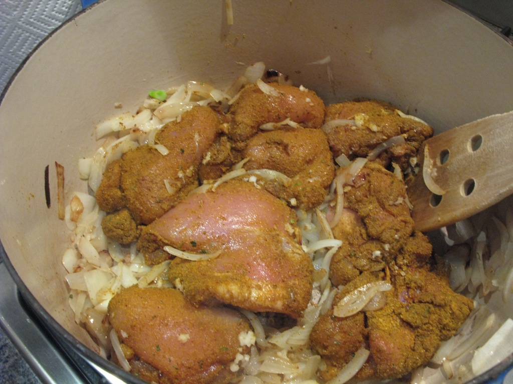 Marinate the chicken thighs with the curry powder and salt for about 30 minutes. Then heat the vegetable oil and fry the diced onion for a few minutes until soft and translucent,. Add the crushed garlic and fry for a minute, before putting in the chicken thighs and frying for 5 minutes until starting to brown.