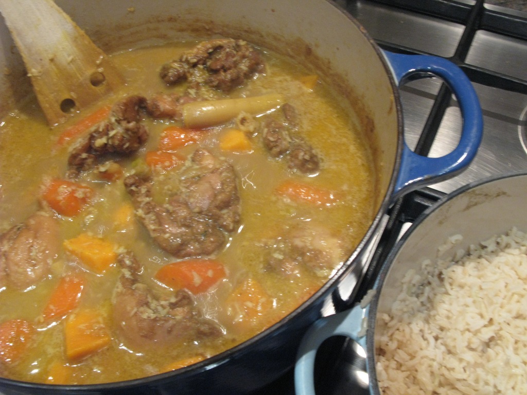 Chuck in the chopped chillies, fish sauce, lemongrass and ginger pieces and fry for a minute or two more. Add the chicken stock and the carrots and bring to the boil, letting everything bubble for 10 minutes. Then add the coconut milk, dessicated coconut (if using) and the chunks of sweet potato, and let everything bubble away for another 10 – 15 minutes, until the sweet potato is tender.