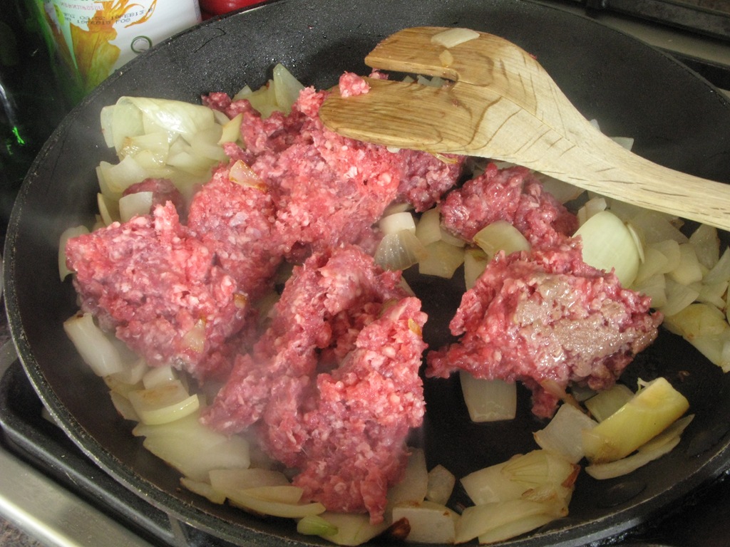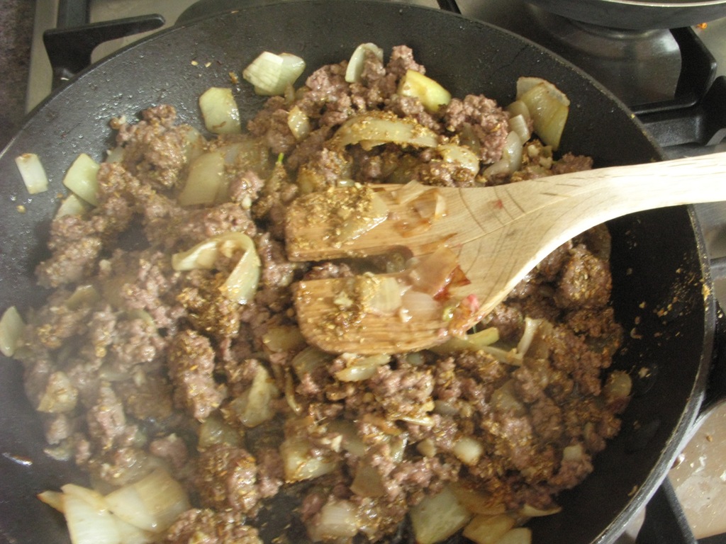 4. Dice the onion, then fry in rapeseed or light olive oil until translucent. Add the beef mince, and fry everything together, breaking the beef mince apart, until the meat is browned. Add the chopped chorizo, crushed garlic and cook for a minute or two, then add the ground coriander and cumin and fry for another minute. Take off the heat. This is the end of the actual cooking part!