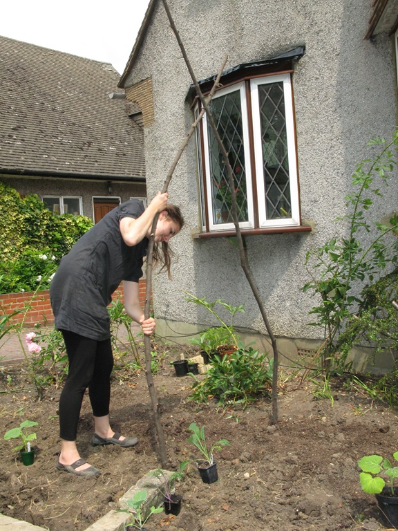 Rachel hard at work, making branch towers for runner beans to climb up: