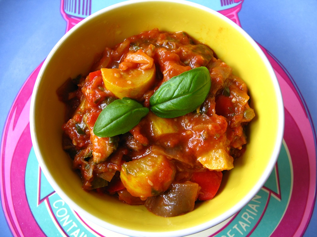 While I didn’t like the heavy lamb dishes that were sometimes part of the menu (it makes me go URGH to this day) I always loved great big ladlefuls of ratatouille that went with it, the workaday summery Southern French vegetable stew brewed up in vats by my grandmother and aunt. It’s proper hearty peasant food, and a great way to use up lots of summery veg while packing a fistful of flavours into one pot. Bold, garlicky and herby, it’s rich with tomatoes and soft, Mediterranean vegetables that taste at their best now: red peppers, courgettes and aubergines. I’ve added a few personal tweaks – you don’t necessarily have to add capers, fennel seeds, paprika or anchovy, but I think it really ramps up the flavour. Don’t be shy with the garlic, and defo don’t hold back on the basil at the end – you could easily use up a whole plant here. And it’s GREAT eaten cold on a hot day.