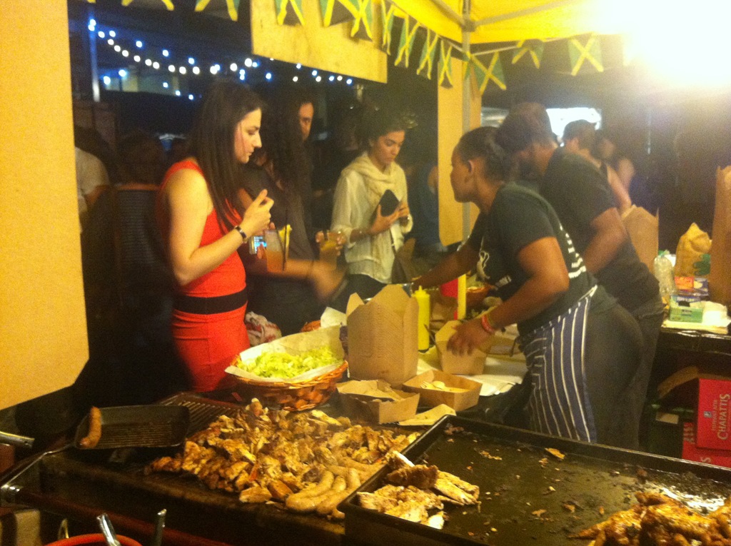 And now there is Street Feast in Dalston Yard, which is essentially a night market where you can eat from loads of different stalls. It’s run by Tweat Up (the folk behind Truckstop and Ginstock) who have corralled together the best of London’s street food slingers to serve up global dishes. You can graze your way around and get a few drinks in, sitting at wooden trestle tables in the corners of what looks like an old warehouse complex with open courtyards. It’s a really energising way to spend time out on a hot summer’s night – despite the queues – and the atmosphere is fantastic. The stall offerings on the night we visited were heavy on the ‘dude food’ – posh burgers, tacos, barbecued and jerked meats etc – and the cocktails were lethal. We drifted around in a cloud of gin, shoving delicious snacks down our throats, and I had intermittent flashbacks of having attended early 90’s psychedelic trance all-nighters (wearing questionable Cyberdog outfits) at Tyssen Street Studios, very close to where we were now enjoying popcorn chicken and Floradora cocktails…