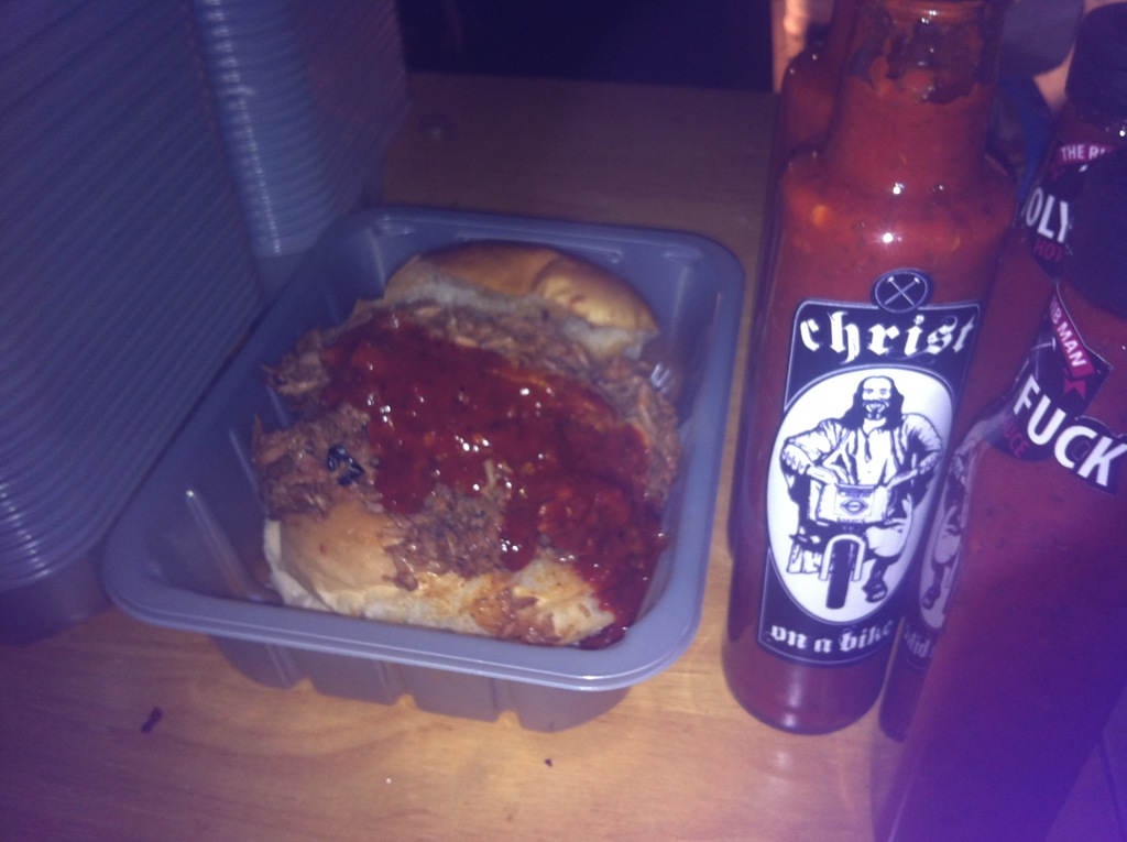Super-delicious barbecued pulled pork in a bun from The Rib Man. Note the ‘Holy Fuck’ and ‘Christ on a Bike’ hot sauces. A bottle of ‘Holy Fuck’ now lives in my kitchen cupboard: