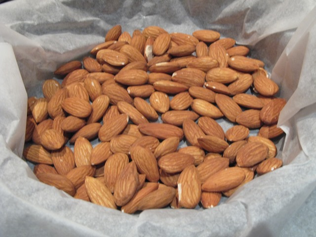 First, roast your almonds spread out in an oven dish on a bit of greaseproof paper, at 180C for 15 minutes. Halfway through roasting, give them a bit of a stir around to ensure that they roast evenly.