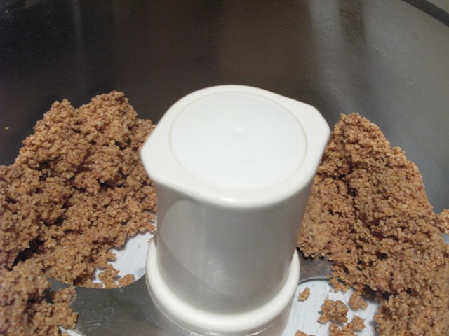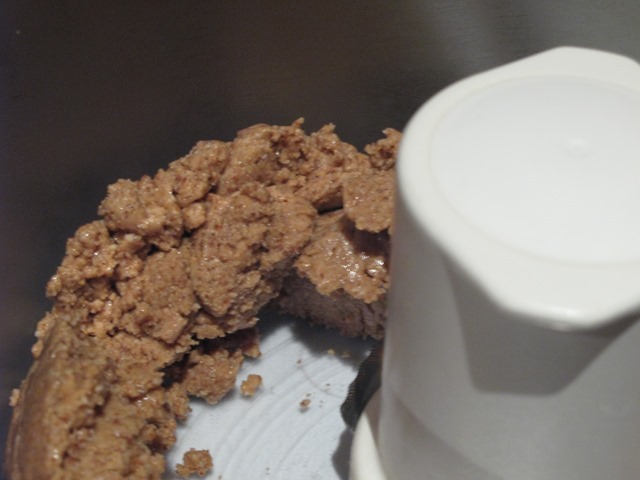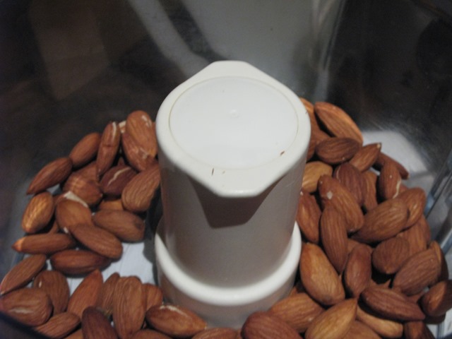 Put the blender on and leave it – the almonds will go through several stages; first, they’ll be ground up into small particles:
