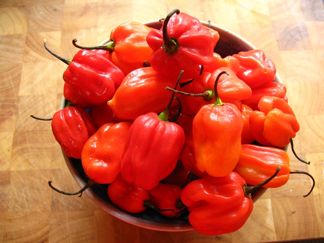 *Not all Costcutters are equal, but our local one (Crystal Palace) has all kinds of amazing goodies – Iranian pastries, Bulgarian cheeses, Turkish honey, crazy pickles and surprisingly good fresh produce such as these jewel-red Scotch bonnets…