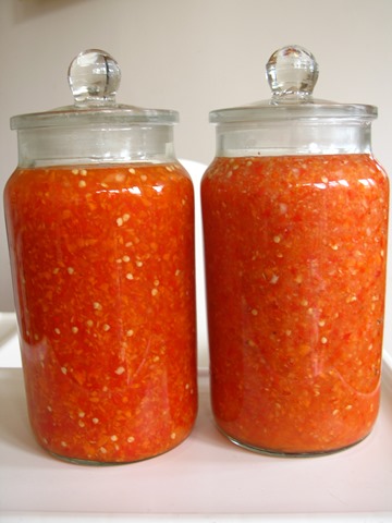 This makes a demon hot and really fruity chilli sauce you can eat right away. Amazing slathered on cheese, fried eggs, and just about everything you can think of. A really easy recipe.