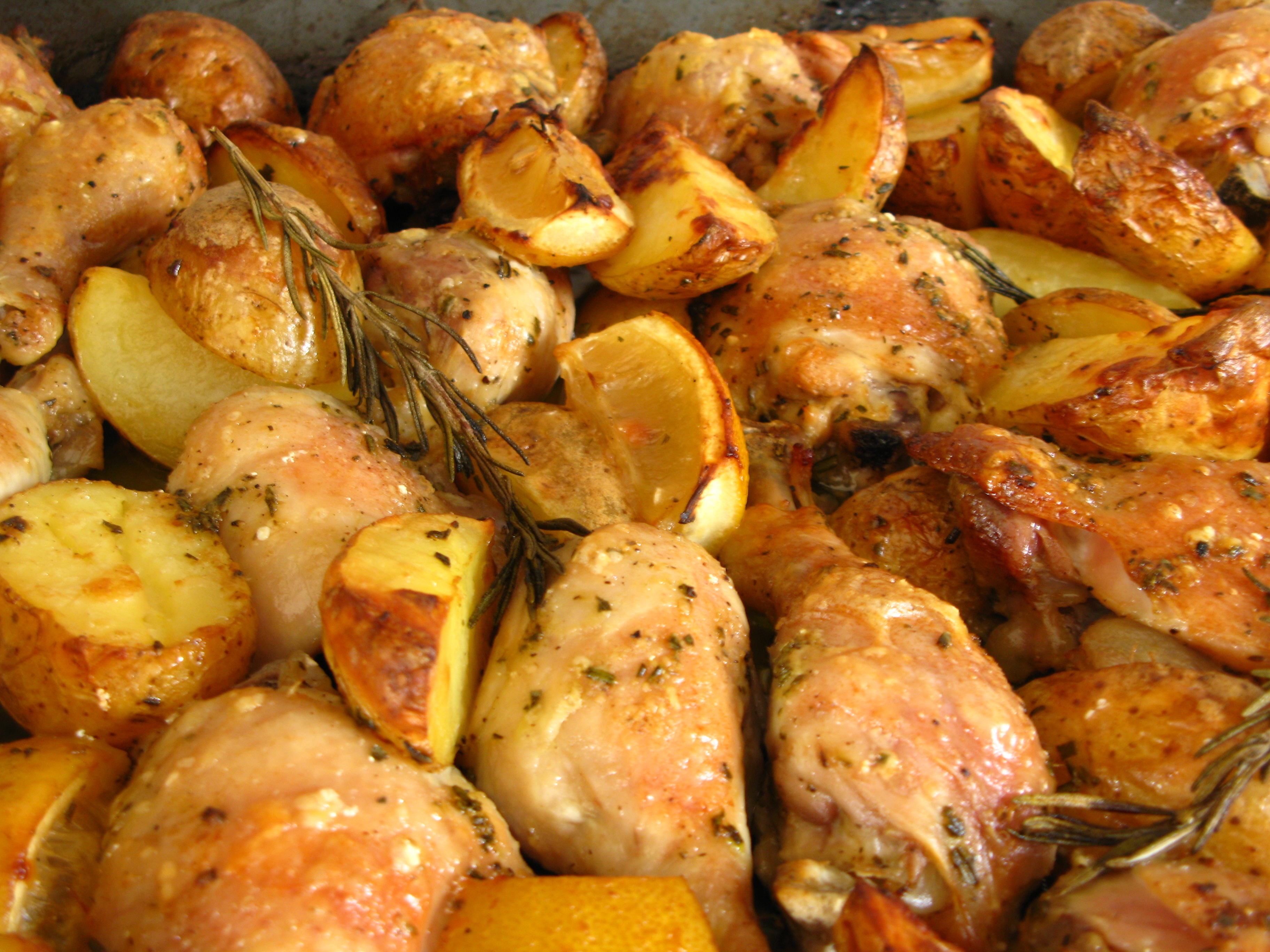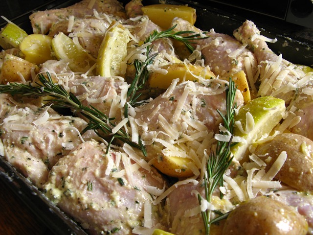 The next day, preheat your oven to 200C. Take the chicken out of the fridge and spread out in an oiled oven tray. Chop up your potatoes into wedges, and your remaining lemons. Add to the tray. Sprinkle over the remaining grated Parmesan cheese. Chuck in a few extra rosemary sprigs if you have them.