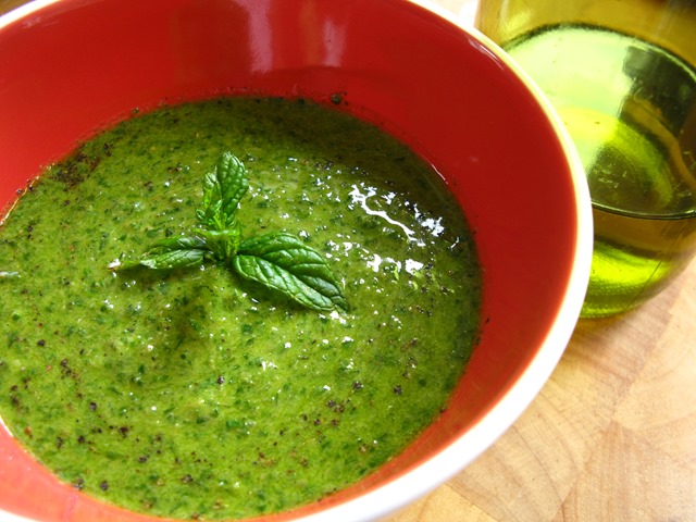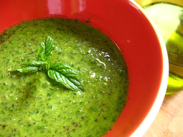 You’ll need a food processor for this sauce. If you don’t have one, I am told you can pound everything up in a pestle and mortar, Italian rustic-style. Just roughly chop your herbs, cheese and garlic and shove it in the food processor together with the rest of the ingredients. Blitz until you get a nice paste – don’t overdo it so that it’s really sloppy, a few lumps here and there give it nice texture.
