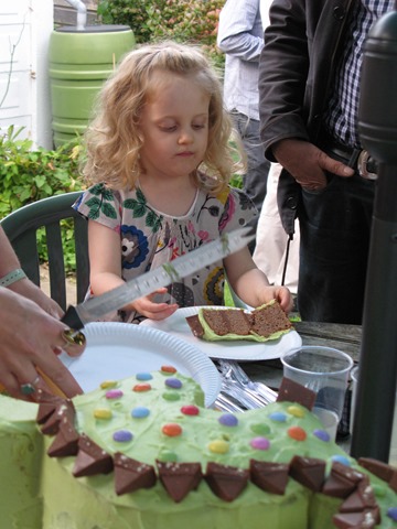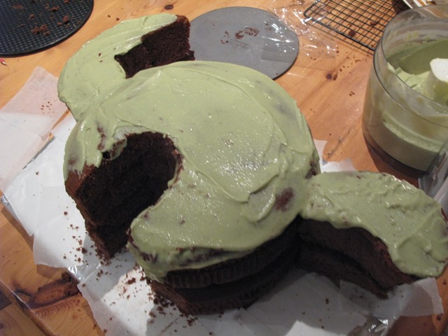 Finally I had to frost this great big creature. Below you can see the first, gloopy layer of green frosting going on. No good at all – you can see the sponge coming through it and it looks well messy, so a second layer HAS TO BE MADE! The spirulina green food colouring makes for a rather tame shade of green, but I was past caring by this point. I had icing sugar in my hair and a chocolate moustache.