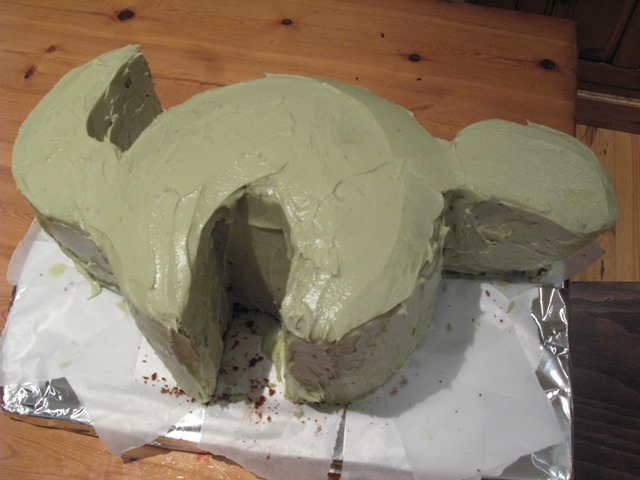 If your big sponges are a bit curved on top (mine were) and won’t lie flat on top of each other, shave a bit off the top of each one with a sharp serrated knife (eg a breadknife) so that they’re less domed on top. Then cut each of the sponges in half with the same sharp knife and sandwich with lashings of frosting. Don’t forget to save frosting for the head and tail, too! (I forgot, um, while eating large amount of frosting off the spatula, then having to make more in a blind panic. There was no more melted chocolate to flavour it either, so I used cocoa. It was fine).