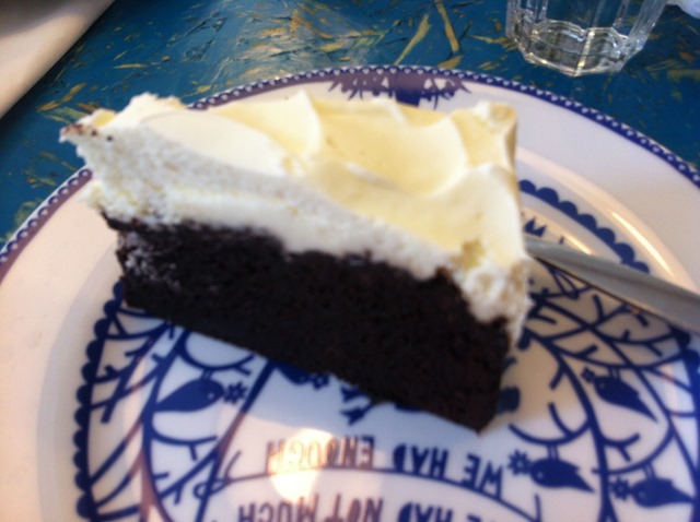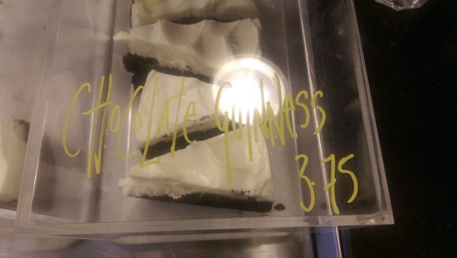 A crap unfocussed photo of the chocolate and Guinness cake. Rich and decadent: smoky chocolate and stout flavours in a fudgy sponge, with a cream cheese frosted top. Mnngggghhhhh: