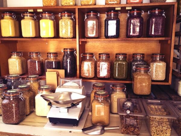 We love visiting The Grain Grocer – technically operating out of a shed – where you can bring your own containers to fill up with nuts, seeds, oils, vinegars and so on. One of its founders, Wade, wears excellent sheepskin hats with massive ear flaps. Here are his wares, all gleaming temptingly from within their jars. If you bring something to refill, it costs you less. I have found weird and wonderful things here – from coconut flour to amaranth and cocoa nibs.