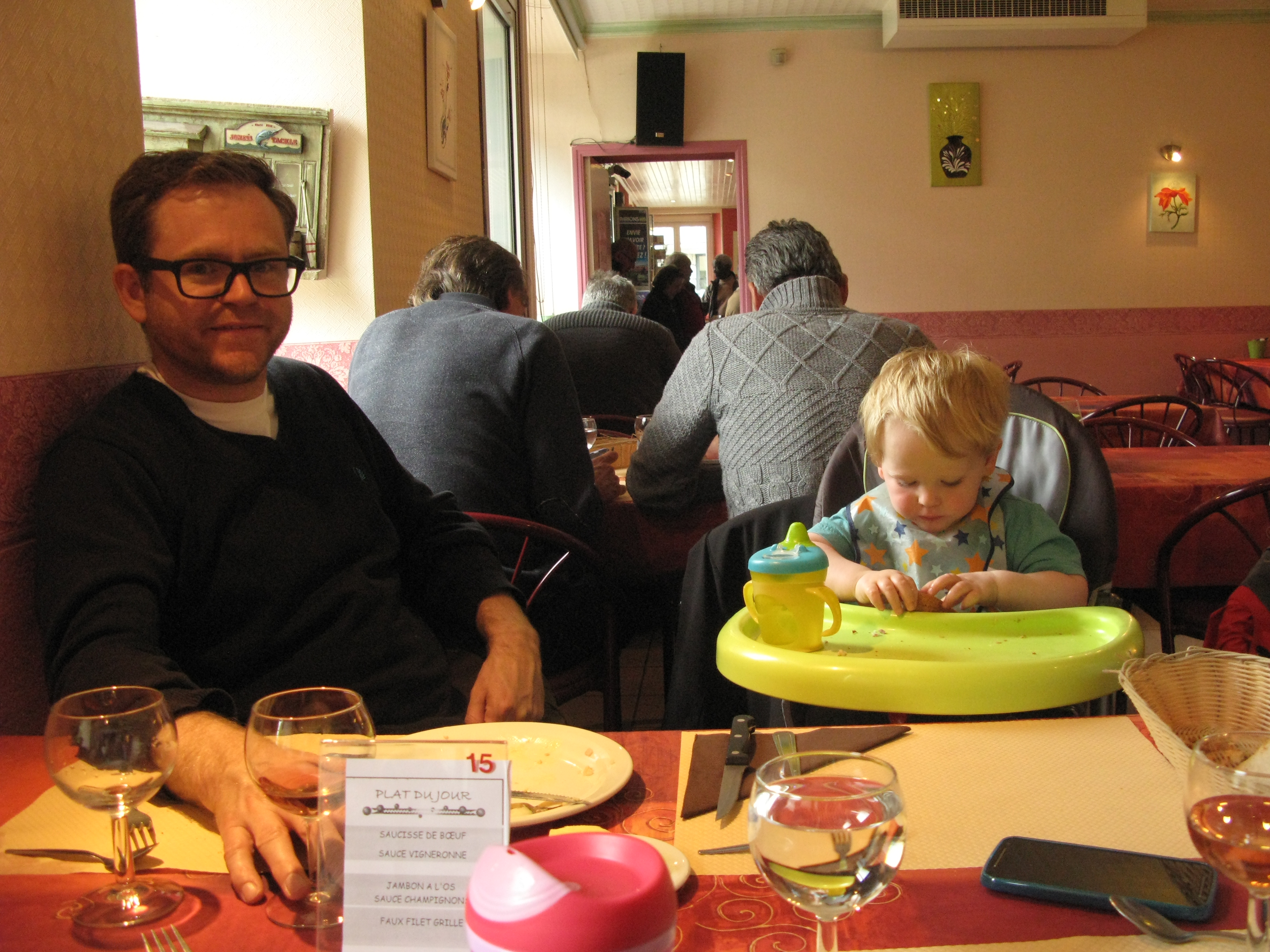 There’s always that tension on holidays abroad to find an ‘authentic’ place to eat like a local, but not wanting to blunder like an idiot into hostile territory where you stick out like a sore thumb. Well, don’t worry about that, because no sooner are you through the door of the bar Chez Marie Thé, you are greeted with mega-warmth by the staff and ushered to a table. Walking into the dining room is like coming into an old auntie’s living room where the decor looks like it hasn’t been updated since the 60’s. This is French Old School – peach and raspberry tablecloths, corny knick knacks, dreadful paintings on the wall. The food speaks for itself – hearty, good flavours and all home made. We ate here twice and the entire restaurant was largely packed out with ruddy-faced blokes (and a few lady farmers too) plus kids, all enjoying three courses and wine. This is a totally normal state of affairs. This is France after all, where I also learned that all kids going to nursery all get three courses for lunch as well. It’s like a different planet!