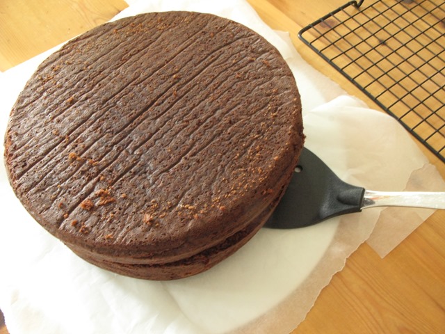 Leave cakes to cool for 10 minutes then turn them onto a wire rack, then remove the paper and cool the right way up. If the top of either of your cakes is a bit ‘domed’ (like my cake below on the right) carefully shave a thin top slice off with a sharp knife to make it nice and flat. Save that bit as a snack to have with some of the cake filling.