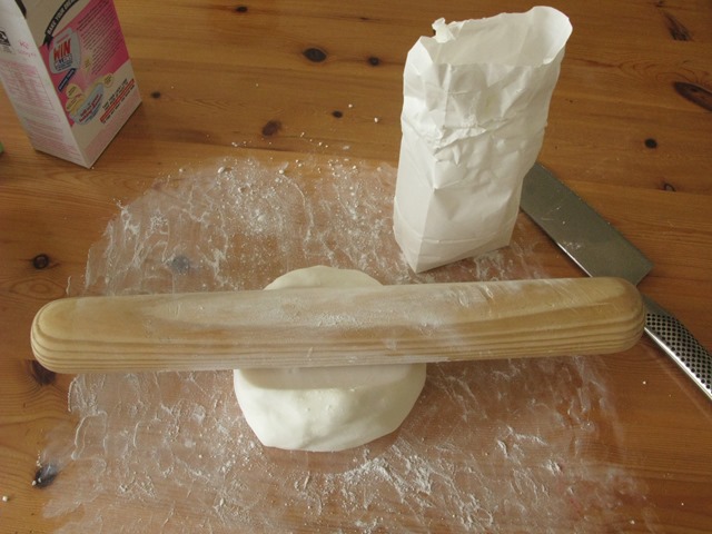 3. Dust the surface of the table with icing sugar, divide your icing block into a large lump and a slightly smaller one (large one for bottom cake, small one for top cake). Roll out your larger lump of icing:
