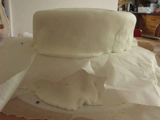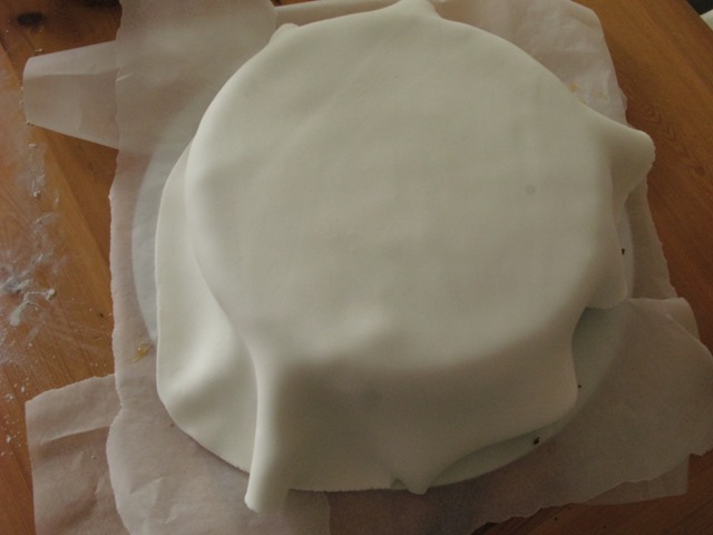 4. Using the rolling pin to carry the icing sheet, drape it over the cake and smooth on with your hands. Pinch together any loose bits of icing. As I’m not a professional cake maker, I have no idea how to make these folds ‘disappear’ but fear not – all the decoration going on top will hide it.