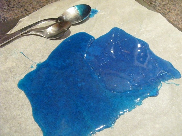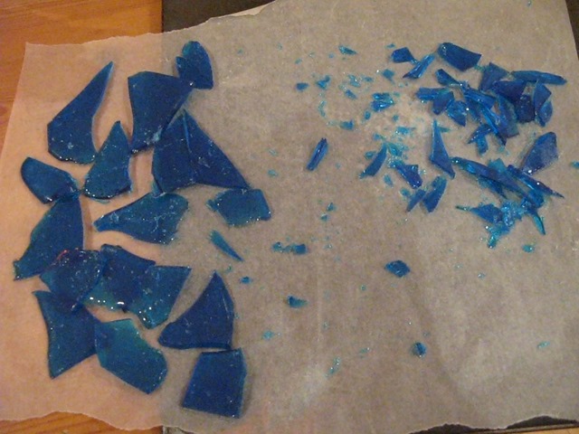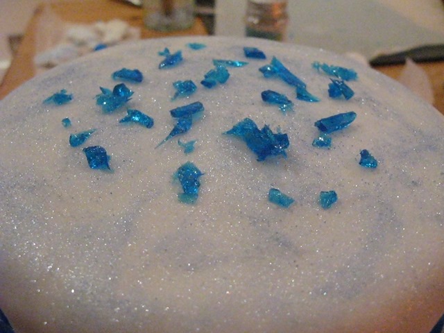9. Now to make the blue ‘ice shards’. Take your packet of isomalt, put it in a pyrex jug and microwave it according to the packet instructions until melted and bubbling. Carefully pour onto a sheet of greaseproof paper on a heatproof surface and wait for it to cool. Then break it with your fingers into shards. Keep the large pieces and the small ones too, you’ll use all of them: