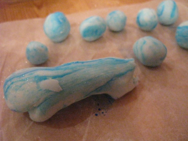 8. Make some snowballs – pipe a bit of blue food colouring onto some leftover icing and roll it into a sausage, then into balls. You’ll need about 15 balls approx: