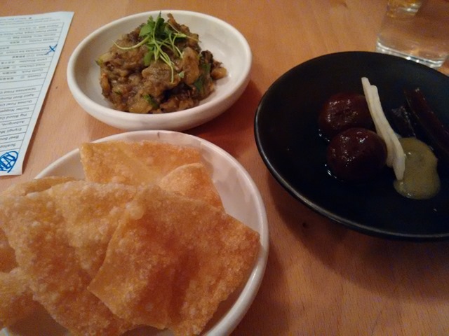 Heavenly smoked aubergine with crunchy wonton crisps, and really weird lovely pickles – tomato, daikon and carrot, with an oniony dipping sauce: