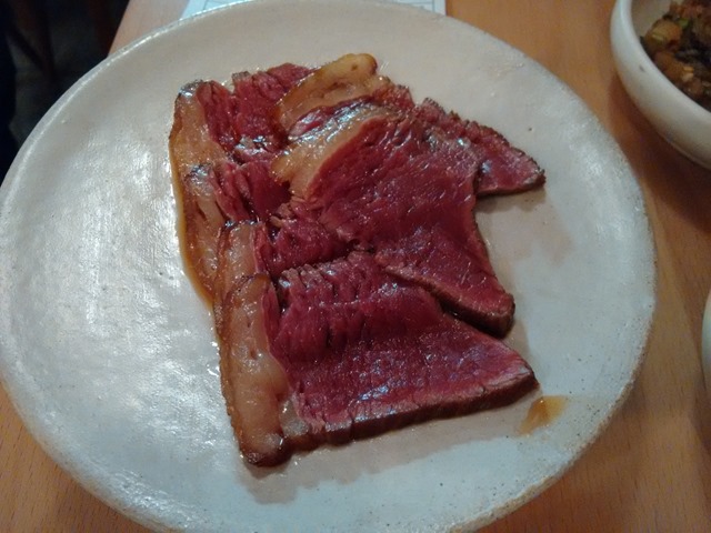 Thin, meltingly tender slices of beef in white aged miso – savoury and smoky: