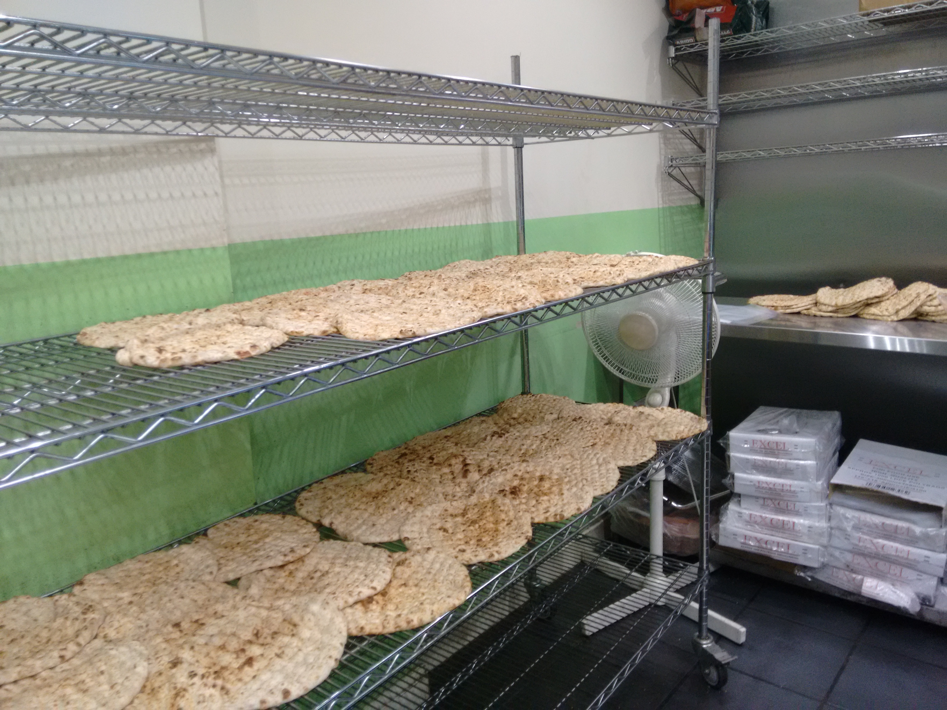 Hot naans being cooled down by a fan as they exit the oven – the smell is amazing: