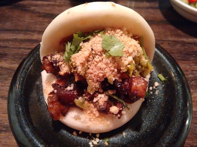 Look at its gaping little Pacman expression, saying ‘eat me, eat me’. It was delicious – soft, pillowy dough housing sticky, savoury aromatic chunks of tender pork, topped with pickles and crispy peanut powder. Yuuuuuuuuuum. Other fillings included a delicious ginger-infused tofu version and fried chicken with kimchi.