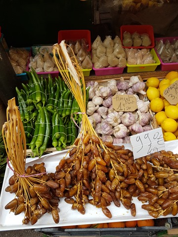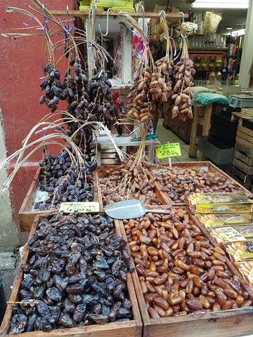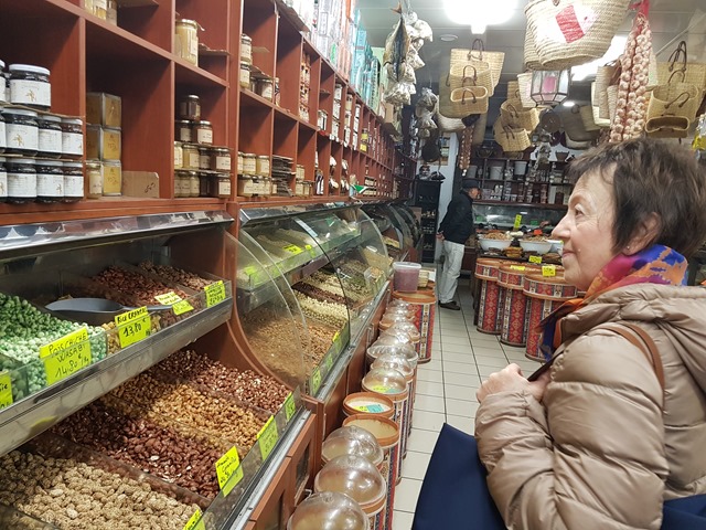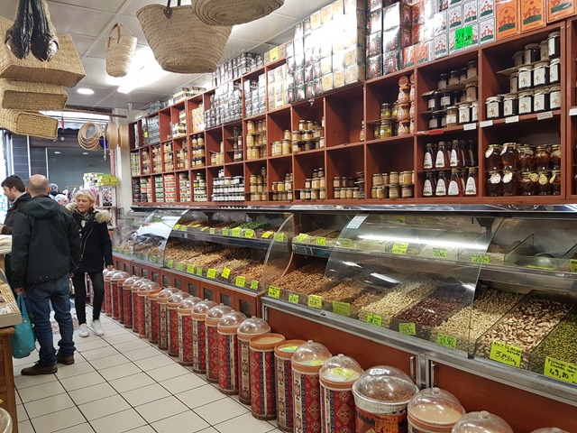 Even though our time there was short, I managed to get out for an explore and walk down to the Marché des Capucins where among the stalls selling colourful fruit, veg and fish I found an Aladdin’s cave of a shop: Saladin Epicerie du Monde. Everything about it screamed ‘Come inside!’, with tables outside displaying huge branches of sticky dates. The shop interior is like an Arabic souk with wall-to-wall spices, nuts, pulses, dried mushrooms, crystallised fruits, grains and so on. There is a huge counter dedicated solely to Turkish delight and sweetmeats. Wall-mounted tanks dispense honey. I saw at least 100 varieties of honey in jars, as well as 20 types of tinned halva, the sweetened sesame paste that my mum is so fond of. I literally burned through £50 in five minutes, and came out with dried ceps (local mushrooms), z’atar seed mix, dates (of course) a couple of jars of honey and a kilo of dried, salted tomatoes. I could have spent all day in there.