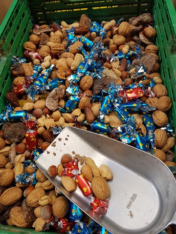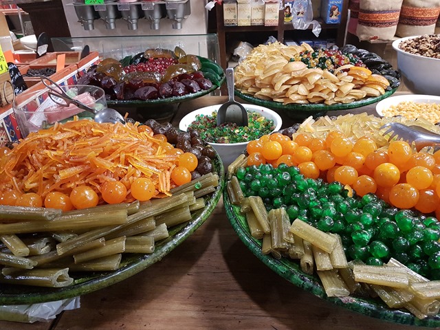 Strange and exotic displays of crystallised fruits and nuts: