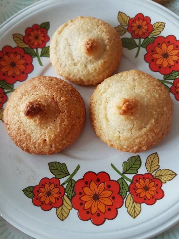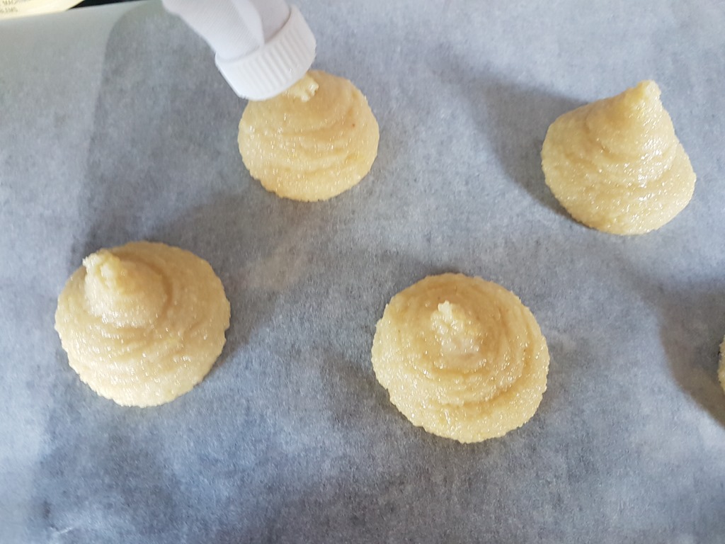 Spoon your mixture into a piping bag. (No need to put a metal nozzle on the piping bag). Squeeze small rounds of mixture onto your baking tray, spacing each biscuit a couple of inches apart. For the softer biscuits, bake at 160C for 20 minutes until lightly golden. For the crunchier biscuits bake for about 30 – 40 minutes at 150C – check they don’t over-brown. Remove from the oven and cool on a wire rack. These biscuits keep well in an airtight Tupperware box for 2 – 3 days, or can be frozen for several weeks (if you can resist eating them for that long).